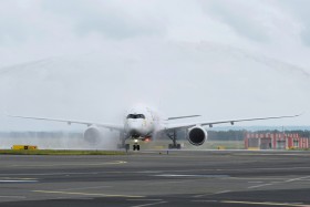 Nový přírůstek do flotily Sky Taxi je vítán slavobránou po příletu z Hamburgu na jeho novou základnu. První Boeing 767 ve verzi -300 doplní ve flotile Sky Taxi stávající dva letouny verze -200, které používají Ostravu také jako svou základnu.
