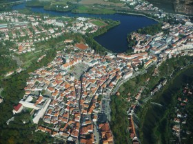 Pohled na město Tábor. Za zmínku stojí patrný výškový rozdíl mezi řekou Lužnicí a Jordánem.