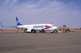 Letoun společnosti Travel Service v Nigeru během letů pro leteckou společnost Air Mediterranee. V pozadí letštní budova. Za zprostředkování poděkování Mirku Šedému