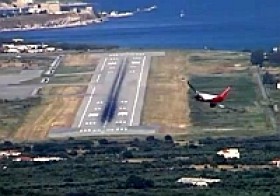 Přistání na Samosu z "ptačího" pohledu. Na tomto letišti je opravdu slabý provoz. V ose dráhy je kopec, takže letadla nalétávají od moře a pravou zatáčkou jdou na přistání. Startuje se proti Turecku, takže po startu prudká zatáčka. Přistání a start je pro cestující většinou dost silný zážitek.