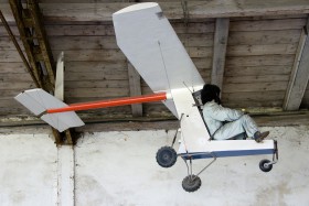 Super secret prototype of a personal flying machine hidden in a hangar at a small provincial secret airport.