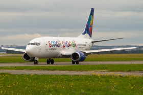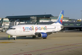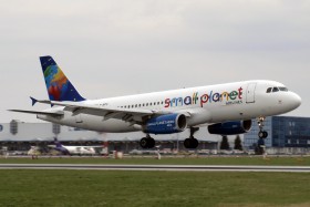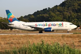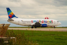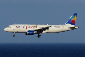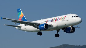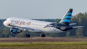 Small Planet Airlines cabin decorated in the colours of the Lithuanian flag, prior a very special flight to celebrate Lithuania's statehood's centennial. The flight drew the number "100" over Lithuania, landing at midnight in the capital Vilnius, which marked the start of Lithuania's Independence Day on February 16th.